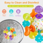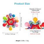 This baby teething toy is a “must have” for parents and babies, its unique design and bright colors will instantly catch your baby’s attention. The compact size and lightweight design make it easy for little hands to grab, an essential teething toy for babies 0-3 3-6 6-9 9-12 months!