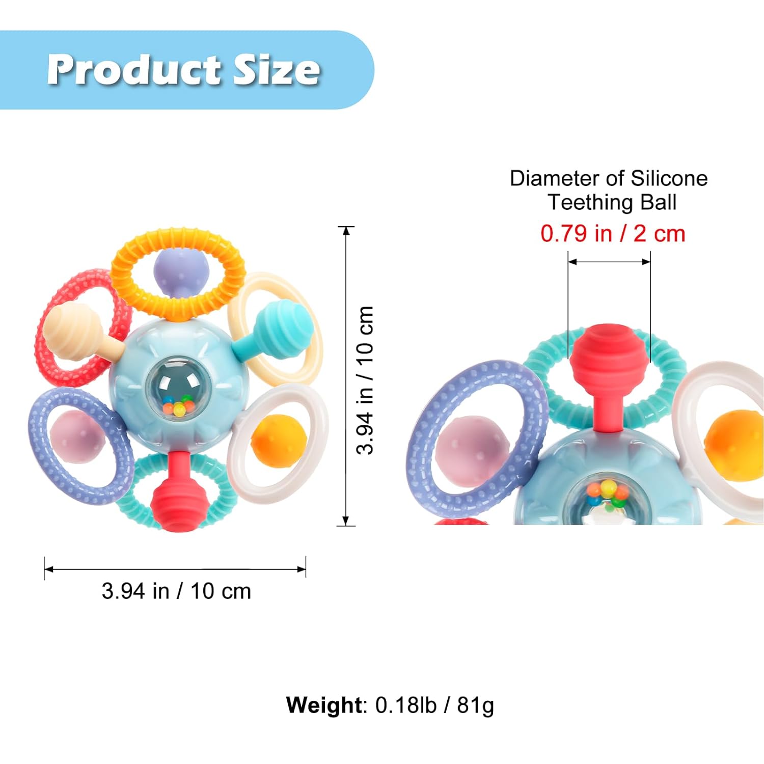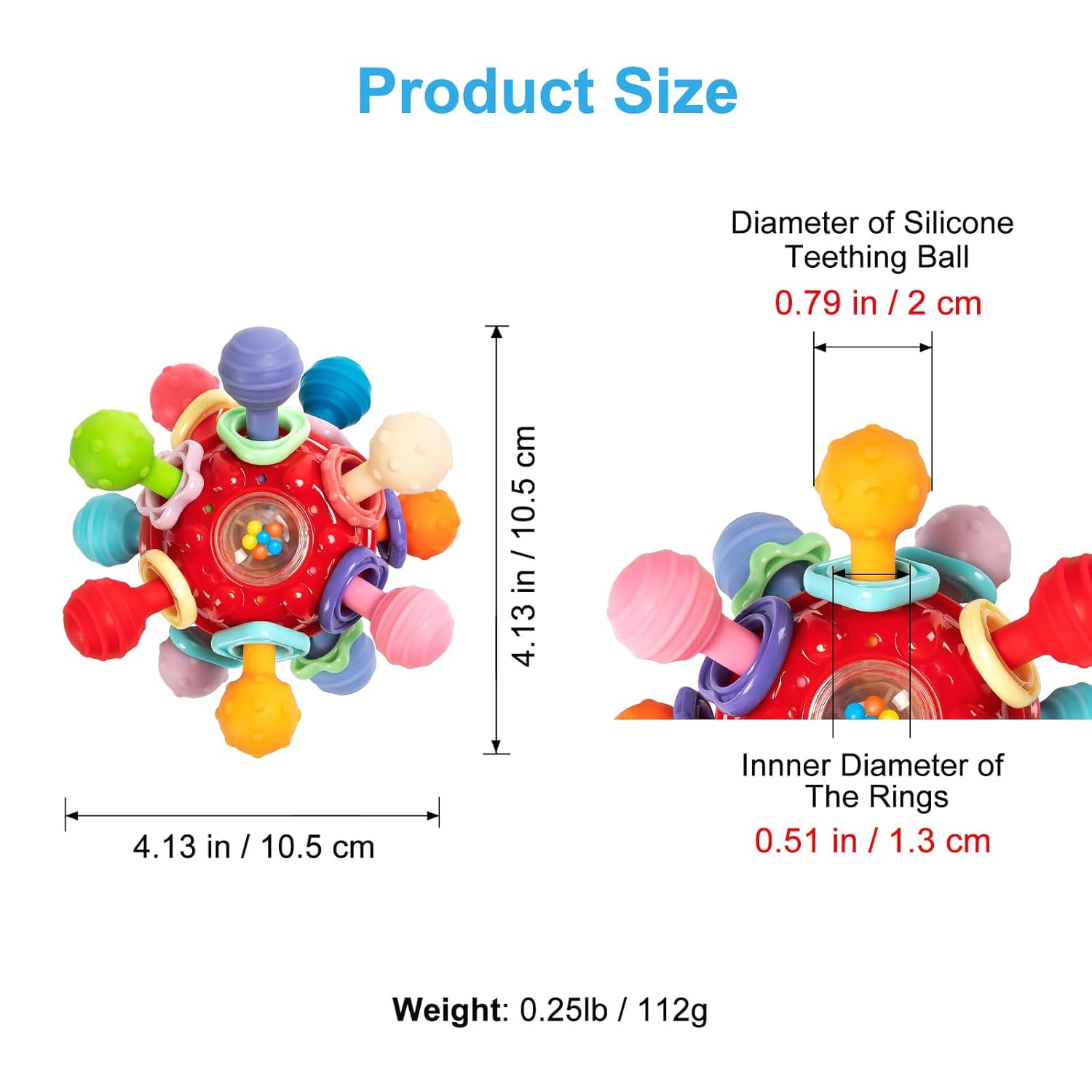The diameter of the silicone teething nubs is 20mm / 0.79 inch, and the inner diameter of the rattle rings is 13mm / 0.51 inch. This baby toy has been tested by a CPSC approved laboratory to the ASTM F963-23 and CPSIA standard, safe to use!
