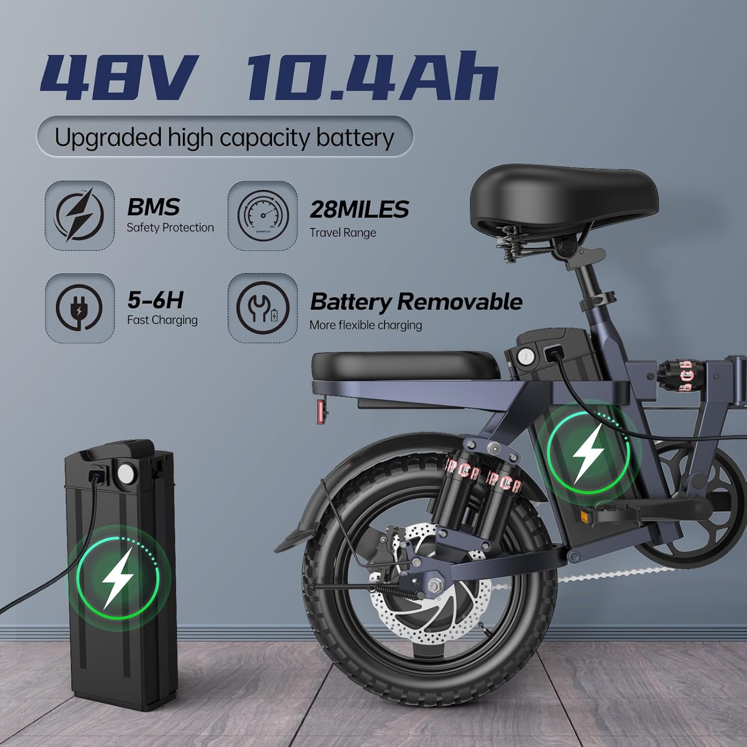 - Powerful and Efficient Performance: Powered by a 400W motor with a peak output of 500W. this e-bike comes equipped with a 499Wh removable battery that charges in just 5 hours. It can travel up to 28 miles on a single charge. climb 37-degree inclines effortlessly. and reach speeds of 20mph safely. Weighing 63.9 lbs. it supports a maximum load of 220 lbs and features 14×2.125 inch wheels for energy efficiency and grip.