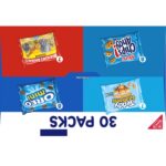 One 30 count Nabisco Team Favorites Snack Variety Pack, 8 OREO Mini, 8 CHIPS AHOY! Mini, 7 Teddy Grahams, 7 Honey & Barnum’s Animal Crackers (packaging may vary)